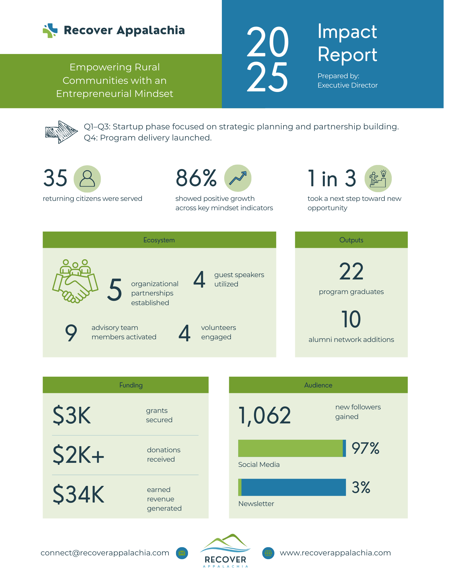 We’re grateful to our partners, participants, volunteers, and supporters who made this first chapter possible. The story of Recover Appalachia is just beginning, but it is already rooted in real outcomes, real people, and real progress.